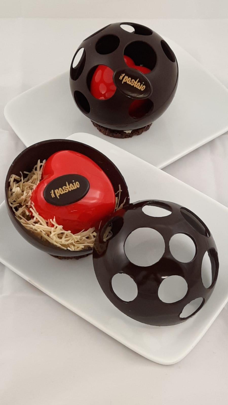 Nicola ha messo al servizio degli innamorati la sua raffinata ed elegante arte pasticcera e per San Valentino ha creato un vero gioiello! Non è affatto un modo di dire, si tratta veramente un piccolo scrigno fatto di cioccolato fondente 72% la cui preparazione deve essere tutt’altro che facile. Il golosissimo guscio liscio e tondeggiante ha infatti degli oblò che permettono di vedere “il tesoro” che c’è all’interno.